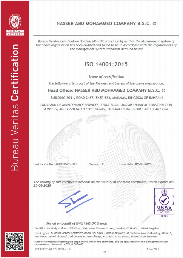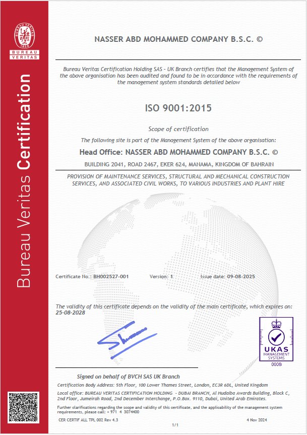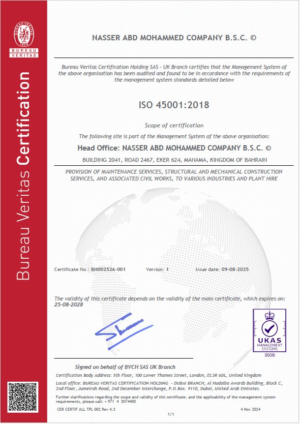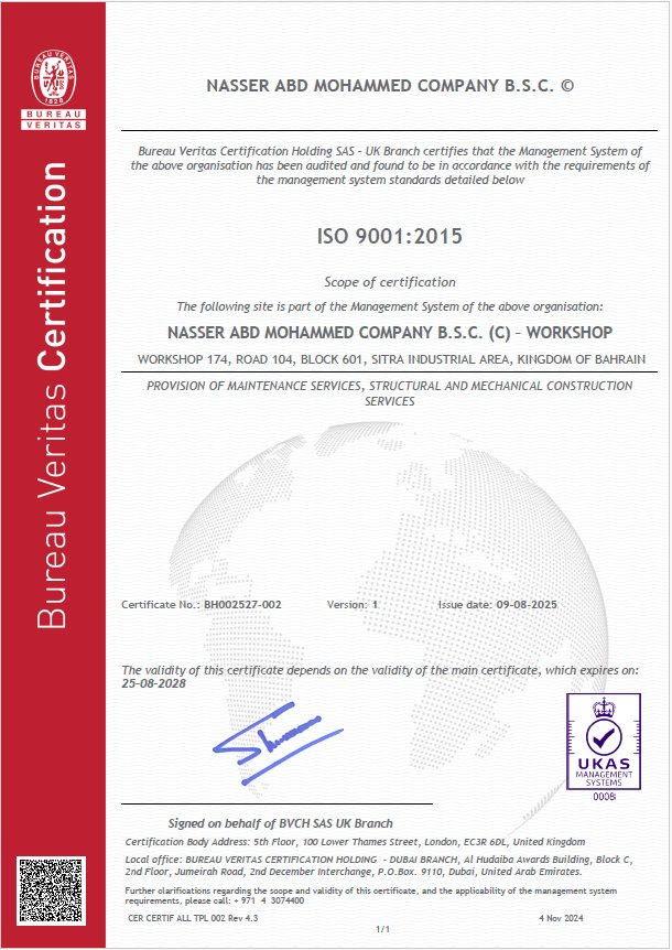 For almost 70 years Nasser Abd Mohammed Company (NAMCO) has successfully played their part in the oil industry of Bahrain providing comprehensive services from Erection of Storage Tanks, Steel Structures, Laying of Crude/Gas pipelines etc.
